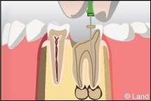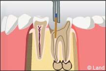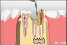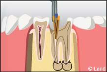 2° Il doit ensuite mettre en forme le canal afin de pouvoir réaliser l’obturation canalaire, le plus souvent à l’aide de gutta-percha chauffée ou froide permettant d’obtenir une étanchéité de bonne qualité afin de prévenir toute ré-infiltration par des bactéries et d’assurer sur le long terme la conservation d’une dent assainie. S’il y avait une lésion infectieuse au bout de la dent, celle-ci guérira, si elle n’est pas déjà trop avancée.