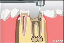 1° Le chirurgien-dentiste va donc procéder à la dévitalisation* de la dent ; en clair il va extirper de la partie centrale de la dent avec les instruments adéquats, soit manuellement soit mécaniquement, la pulpe dentaire constituée de filets nerveux et de très fins vaisseaux sanguins. Cette étape permet d’enlever la totalité des tissus nécrosés ou infectés et de procéder à un nettoyage soigneux anti bactérien.